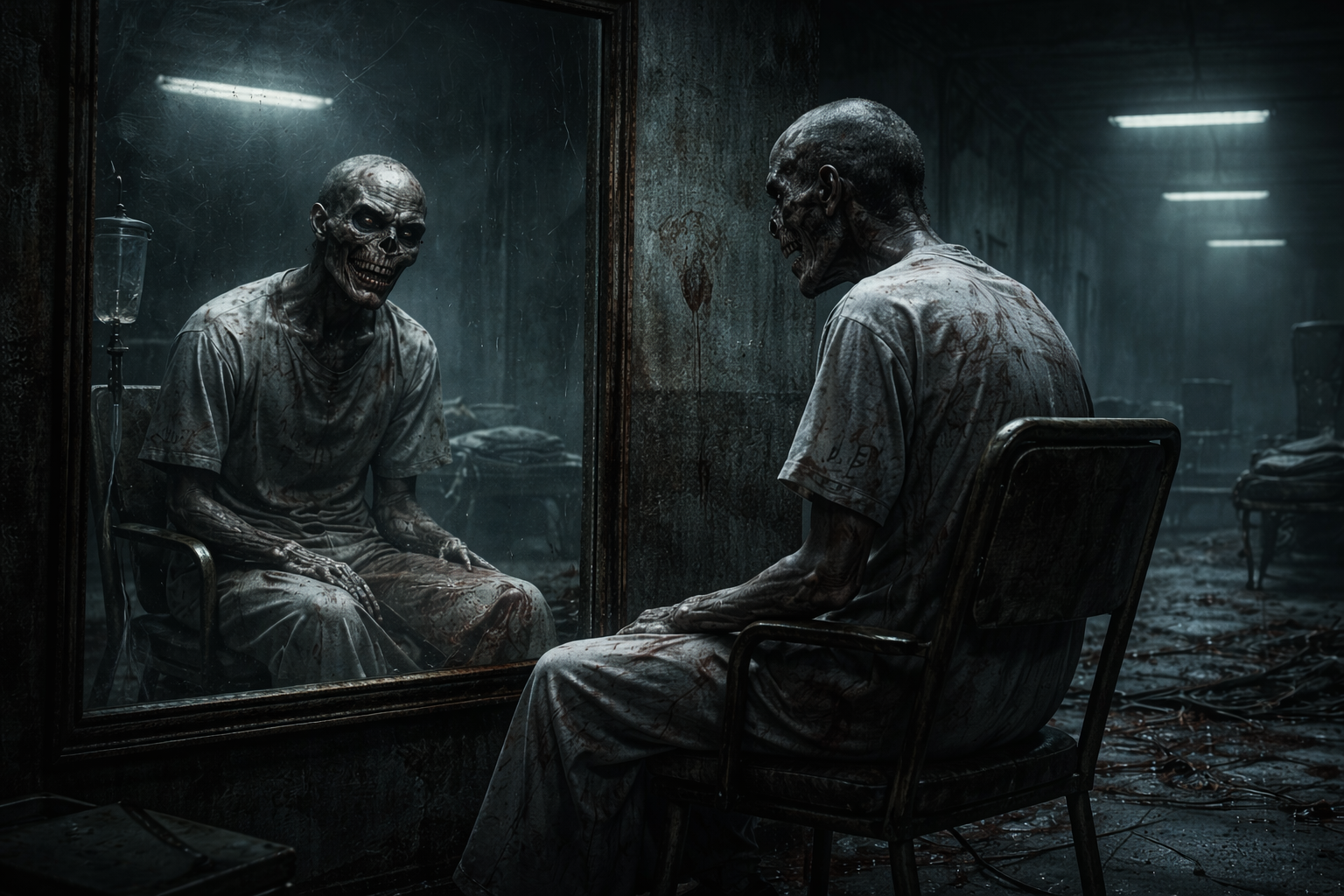Esa cosa solo estaba sentada ahí, inmóvil, con una bata blanca colgando de su cuerpo esquelético, con números tatuados en el brazo, con ojeras profundas y una mirada vacía, como la de alguien que llevaba años sin dormir… aunque ya no parecía humano. Retrocedí aterrado, negando con la cabeza, repitiendo que eso no era posible, que yo estaba de pie, que yo estaba sano, que solo había entrado a explorar, que nada de esto era real.